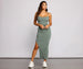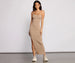 Bring the good vibes in a maxi dress that can be dressed up for a chic day out. The dress features a scoop neckline, sleek bungee straps, and a maxi length silhouette with a high side slit. Style dress with chunky sneakers and sleek hoops.