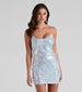 Gorgeous babes look the best in sequins! Style up this glimmering iridescent mini dress for a stunning look. It features a sleeveless scoop neckline, bungee spaghetti straps, an open back with a dual bungee strap design, and a short, curve-hugging, bodycon silhouette. The sheer mesh fabric includes a full knit lining and features all-over embroidered sequins in a damask pattern. Complete the look with platform heels.
