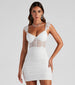 You'll fall in love with the gorgeous lacy vibes of this bodycon mini dress. It features a sleeveless sweetheart neckline with padded cups, thin eyelash lace shoulder straps, a sheer corset-designed bodice, ruching down the sides, and a short, curve-hugging silhouette. Style with clear heels.