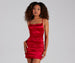 Showcase your stunning beauty in this chic satin mini dress! It features a sleeveless square neckline, spaghetti straps, a backless design with a tie strap detail, all-over ruching, and a mini-length, curve-hugging silhouette. Complete the look with hoop earrings and new heels.