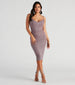 Bring the sparkle and shine to your dressy look with this gorgeous glitter knit midi dress! It features a sleeveless cowl neckline, spaghetti straps, a low scoop back with a rhinestone embellished bar strap, a high waist seam, a midi-length silhouette, and a curve-hugging fit. The glitter knit fabric offers a moderate stretch. Style with glitzy rhinestone earrings.