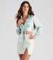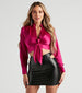 You'll be ready for happy hour with the girls in this sleek satin cropped blouse! It features a collared V-neckline, a tie-front, button-down design, long sleeves, and a cropped, form-hugging fit. Style with a mini skirt and heels!