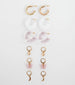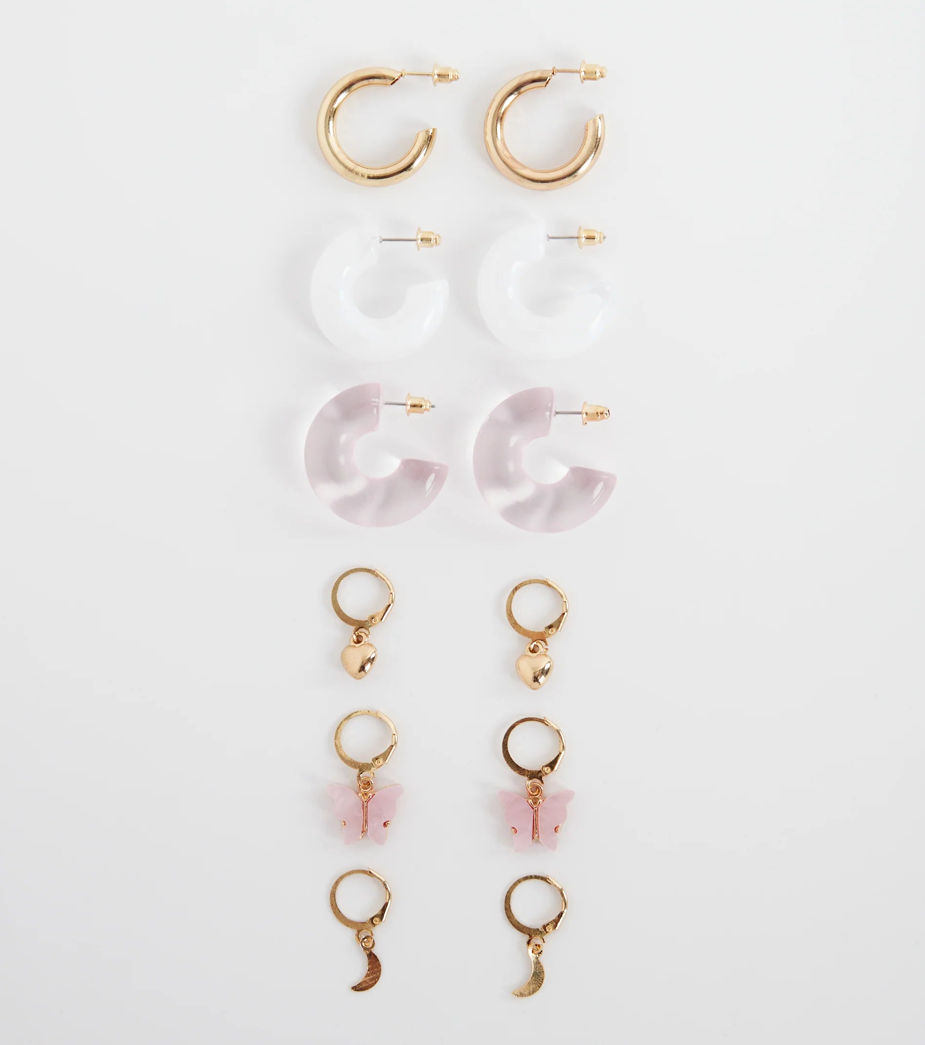 Your heart will align with this six-pack earring set! They feature three pairs of mini hoops with heart, butterfly, and moon charms. Three pairs of medium-sized hoops with clear white and pink hoops and a pair of sleek gold metal hoops. Complete the look with trendy block heels for an event.