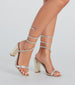 These statement block heels are the perfect combination of elegance and allure! Featuring a square toe, rhinestone-embellished chevron pattern toe strap, and a spiral ankle strap with more rhinestone embellishments, this block heel will make you sparkle! Complete the look in fringe earrings for a gala dinner or school dance!