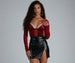 Shine for the holidays in this luxe velvet bodysuit perfect for every party! It features fitted long sleeves, a v-neckline with rhinestone trim, and a sultry mesh accent, dual snap closure on a thong cut bottom. Style with a faux leather skirt and sparkly heels.