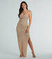 Everyone will be intrigued by the glamorous Hollie glitter formal dress at weddings and banquets! Made from a glitter knit fabric for the perfect shimmer all night. She features a halter spaghetti strap that ties at the neck, a flattering cowl neckline, and a slim silhouette, this dress is perfect for your next formal event. The dual side slits and long hem add a touch of elegance while showing off your heels of the night! Complete the look in stiletto heels and a clutch.