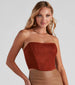 Flaunt your fab self for your honey in this faux suede bustier featuring a strapless bodice with non-slip grip lining, flexible boning inserts, a cropped hem, and a back zipper closure. Complete the look in a sleek mini skirt and basic heels.