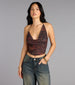 This leopard print mesh halter crop top brings all the heat with a draped cowl neckline, hoop hardware, and an open back that ties just right.