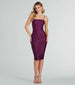 Showcase an iconic silhouette in this ruched bodycon midi dress that will flaunt your curves! Designed with a sleek and stretchy knit fabric, this mid-length dress features a sleeveless square neckline, spaghetti straps, an open back with a lace-up strappy design for a customized fit, a lower back cutout followed by a zipper closure, ruched back and side seams, and a bodycon fit. Style with metallic heels for a pop of glamour.
