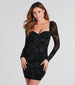 This mini dress is in bloom for the holiday season! It features sheer fitted long sleeves, a sweetheart neckline with a padded bust, a front ruched seam for added flair, and a bodycon silhouette. The dress is designed with a romantic velvet floral burnout pattern on mesh fabric with a stretchy knit lining. Complete the look with earrings for a holiday dinner or party!