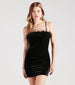 Unlock an irresistible charm in this velvet mini dress for dressy soirees! It features a sleeveless square neckline with diva-chic marabou trim, spaghetti straps, a front ruched seam, and a flattering bodycon silhouette. Complete the look with a sparkly clutch and heels.