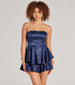 A strapless satin romper features a corset bodice with flexible boning, a flirty tie waist, and a ruffled layered short-length silhouette. Perfect for the school dance or a party.