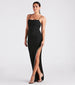 The Jacie formal crepe long dress knows how to make an entrance! She features a sleeveless pleated square neckline, spaghetti straps, flexible boning inserts in the bodice, a form-hugging slim silhouette, and a high side slit with a dazzling rhinestone trim leading to her long hem. The formal long dress is composed of a crepe knit fabric with a moderate stretch. Complete the look in fabulous rhinestone stiletto heels for a gala or fancy wedding!