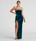 Your evening awaits in the Janet formal dress! She features a strapless, square neckline that shapes the empire waist and fitted bodice. The side ruching creates the illusion of curves while the high front slit displays a sexy show of leg. Her luxe velvet-lined fabric offers a minimal stretch. Add a sparkly clutch to complete your look.