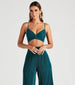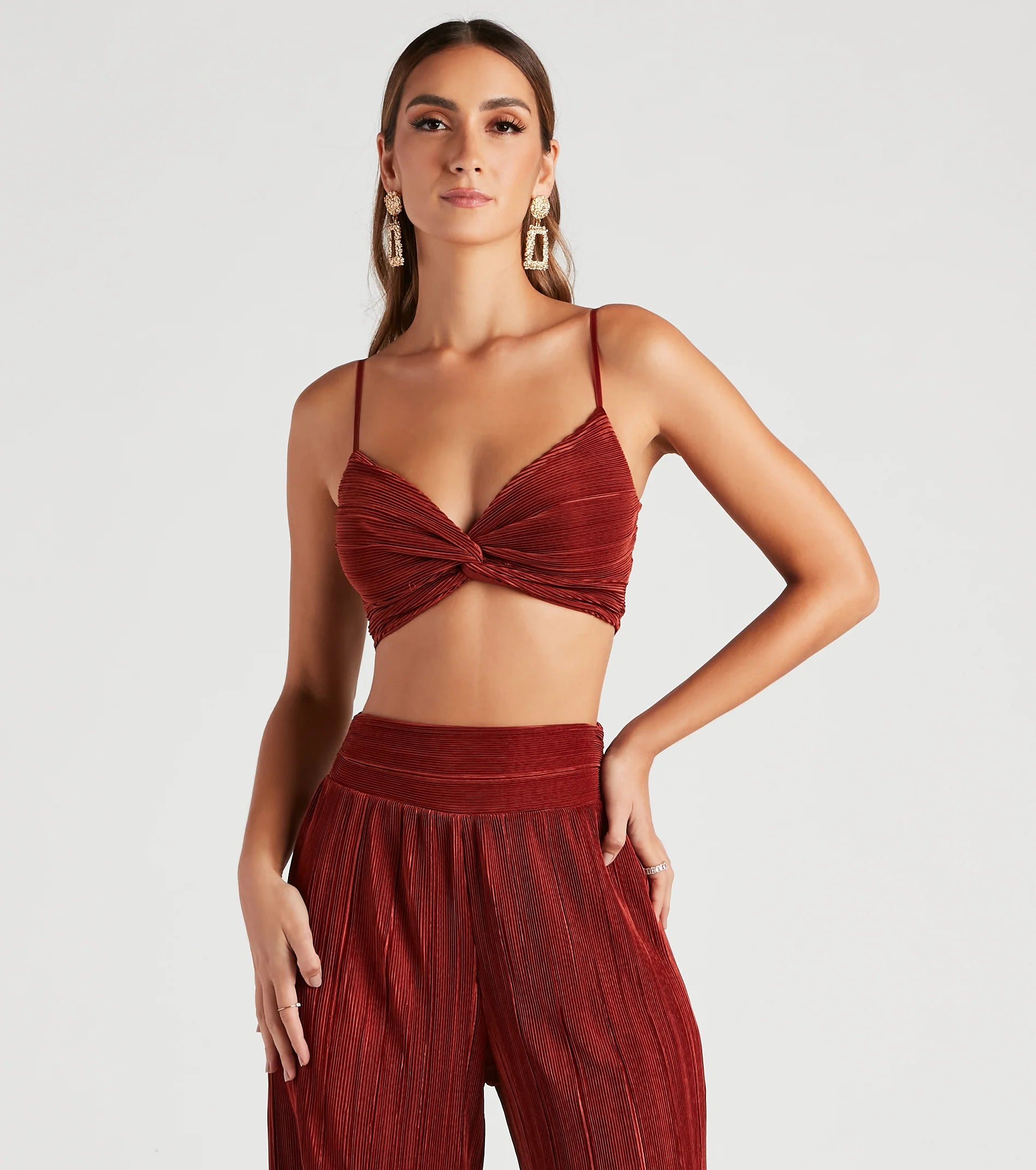 Enter the room of the rhythm and blues! All eyes on you in this saucy crop top featuring a sleeveless, sweetheart neck, adjustable spaghetti straps, and a twisted bust, on pleated-lined fabric. Complete the look in the matching bottoms.