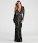 Make it an enchanting evening in the Jennie formal long dress sure to take everyone's breath away when you enter the room! She features long fitted sleeves with shoulder pads, a plunge V-neckline, and a form-hugging mermaid silhouette that kisses the floor in a long-length hem. The formal dress is designed with an intricate rhinestone embellished pattern on mesh fabric with a knit lining. Complete the look with fringe earrings for a holiday gala or charity ball!