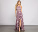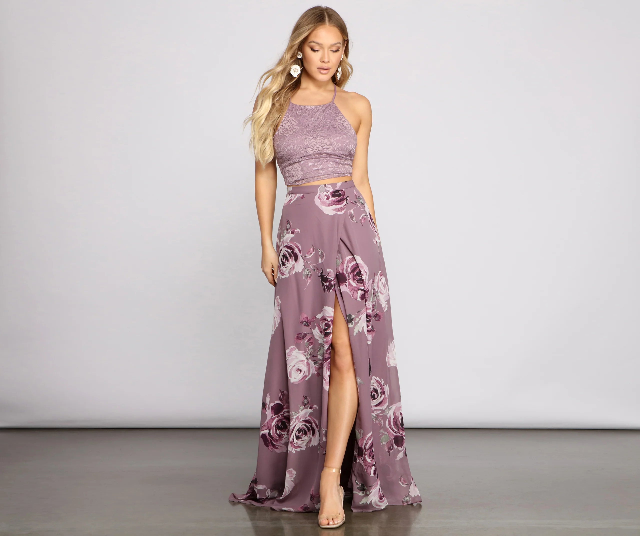 Make a stunning entrance this season in the gorgeous Joelle two-piece dress. She features a lined lace top with a high neck, spaghetti straps that lead to a cross-back and lattice design, and a cropped, form-hugging fit with a scalloped hem. Her high waist floral printed chiffon skirt has an overlap design and flows out to a floor-length A-line silhouette with a front slit. Complete the look with dainty earrings and new heels.