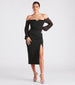 Chic and sophisticated, the Jolene formal midi dress is a stunning pick for rehearsal dinners or cocktail soirees! She features a chiffon bodice with an off-the-shoulder neckline, sheer peasant long sleeves, and a V-wired front. Her form-hugging silhouette offers a flattering front slit and a midi-length hem. The formal dress is composed of a crepe fabric with a sewn-in knit lining and plenty of stretch. Complete the look in sparkly platform heels.