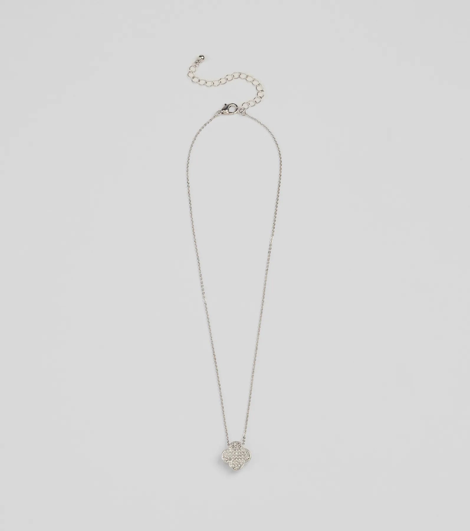 Bring luck to your day accessorizing with this rhinestone clover charm necklace secured with a lobster clasp closure. Pair with a ring set and purse.