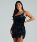 Step into the room and absolutely slay in the Katrina bodycon dress. She features a one-shoulder neckline with dual bungee spaghetti straps, a small side slit, and a short, curve-hugging silhouette. The dress is composed of a velvet fabric adorned with iridescent sequins and includes a stretchy knit lining. Complete your glam look with a new pair of heels.