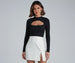Keep it chic with a crop that impresses with bold details! The top features a mock neck, a cutout at the bust, and long sleeves. The top is composed of a cotton knit fabric that offers a form hugging fit with a moderate stretch. Complete look with a mini skirt.