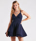 Get ready to dance and twirl with a flirtatious flair in the Kennedy formal skater dress! She features a sleeveless V-neckline with a built-in padded bust, dual spaghetti straps that lead to an open back with a strappy cross-back design, dual high waist seams, a short skater skirt with a tiered ruffled overlay and banded hems, and a flattering fit and flare silhouette. The lined crepe fabric offers a moderate stretch. Style with platform heels for your bachelorette party!