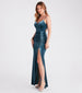 A timelessly glamorous style for bridesmaids or wedding guests, the Kierra Formal Glitter Velvet High Slit Dress brings sophistication and elegance. She features a sleeveless sweetheart neckline with a wired insert, bungee spaghetti straps, a padded bust, and a back cutout with a hook-clasp closure. Her front ruched seam and high front slit provide an alluring texture, while the long-length hem and A-line silhouette promise a flattering fit. Glittering velvet knit fabric offers the perfect sparkling touch and has a bust lining and moderate stretch. Complete the look in a necklace and earrings set.