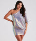 Kimberly is here for your dramatic entrance into every holiday party! She glistens and gleams in a shimmering array of sequins that dance along her one-shoulder neckline, flowy kimono-style sleeve leading to her draped bodice, and short bodycon silhouette. The formal dress is composed of a sequin-knit fabric with a sewn-in knit lining and minimal stretch. Style your hair with a glamorous comb or barrette to create a flawless side part!