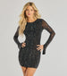 Bring the glam in a mini dress that features a round neckline, sheer long sleeves, a bold open-back design, and rhinestones throughout. Complete look with a rhinestone clutch.