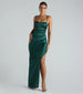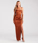 Light-catching satin on the Kira formal dress highlights your sense of style this party season! She features a sleeveless sweetheart neckline, sleek spaghetti straps, a pleated side seam atop her sultry high slit, a flattering slim silhouette, and a long hem. The formal dress is crafted from a smooth and silky satin knit fabric that brings the luxe to your night! Complete the look with sparkly earrings and a clutch for a school dance or fancy dinner banquet.