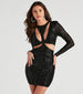 Klarissa shines with sequin and sultry detailing to keep all the eyes on you! She features long sleeves, a high neckline, and a cutout bust leading to her bodycon mini-length hem. The formal dress is composed of a shimmering sequin embroidered knit fabric with minimal stretch. Complete your dressy look with a clutch and heels!