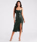 Debut a sparkling opulence in the Kourt formal sequin dress perfect for banquets or cocktail parties where you are sure to shine! She features a sleeveless square neckline, adjustable spaghetti straps, a lace-up back designed to turn heads, and a flattering bodycon silhouette, front slit, and a midi-length hem. The formal dress is composed of a sequin-scroll embellished pattern that shimmers under any lighting on mesh fabric with a stretchy knit lining. Complete the look with a statement ring set.