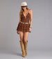 Sweet but with a little spice—this lace romper stuns with a plunging V neckline, open tie back, and playful ruffle trim. Perfect for lunch dates, garden parties, or just stealing the spotlight.