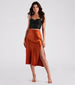You'll be living lavishly in your new must-have satin midi skirt perfect for dinner parties, celebrations, and holiday events! The skirt features a sleek high-rise waist, side zipper and hook-eye closure, a curve-hugging silhouette, and a high-cut side slit. Complete the look in a crop sweater and heels!