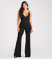 Lead the way in this of-the-moment wide-leg jumpsuit perfect for a ladies night out! Featuring a sleeveless surplice V-neckline with 3-D flower decor, spaghetti straps and an open tie-back design, a hip-hugging fit, and a wide-leg silhouette. Complete the look with teardrop rhinestone earrings and heels.