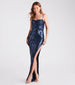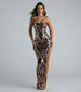 Leave the room breathless in the captivating Leah formal dress showcasing a regal sequin scroll design that elevates the night! She features a sleeveless cowl neckline, adjustable spaghetti straps to customize the fit, a high waist seam, and a form-hugging silhouette with a sultry high-cut side slit along the floor-length hem. The formal dress is composed of a sequin-scroll patterned mesh fabric with a sewn-in knit lining and minimal stretch. Complete your stunning look in chandelier earrings and heels.