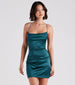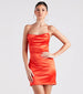 Watch the party come to life when you make an appearance in the Leanna satin mini dress perfect for celebrations! She shines in a sleeveless cowl neckline, bodycon silhouette, and sleek bungee spaghetti straps that shape the strappy, open-back design. The formal dress is composed of lined stretch satin fabric with a glossy sheen. Style with rhinestone heels and a clutch to complete the look!
