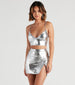 Get ready to glow and illuminate the night in this metallic crop top! It features a sleeveless V-neckline, spaghetti straps, a cropped, form-hugging fit, and a vibrant metallic sheen. The lightweight faux leather fabric has a moderate stretch. Complete your party look with the matching mini skirt.