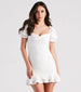 Look like a daydream come true in this eyelet lace mini dress for your next date! It features adorable puff sleeves with ruffle trim, a sweetheart neck, a ruched bust seam, and a bodycon silhouette with a flirty tiered ruffle hem. Complete the look in cute stiletto heels.