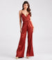 Give off a luxe aura in this chic satin wide-leg jumpsuit! It features a sleeveless V-neckline with a pleated wrap-front design, adjustable spaghetti straps for a customized fit, a high-rise cinched waist with an adjustable tie-front detail, and a wide-leg silhouette. The smooth satin fabric will showcase a stunning sheen. Style with platform heels for date night.