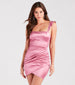 You'll be looking oh-so-pretty in this silky satin-knit mini dress! It features a sleeveless square neckline, ruffled tank shoulder straps, princess seams and a high waist seam, a faux wrap-front design creating an asymmetric mini-length hem, and a bodycon silhouette. The smooth satin-knit fabric offers a moderate stretch. Style with rhinestone fringe earrings and clear heels.