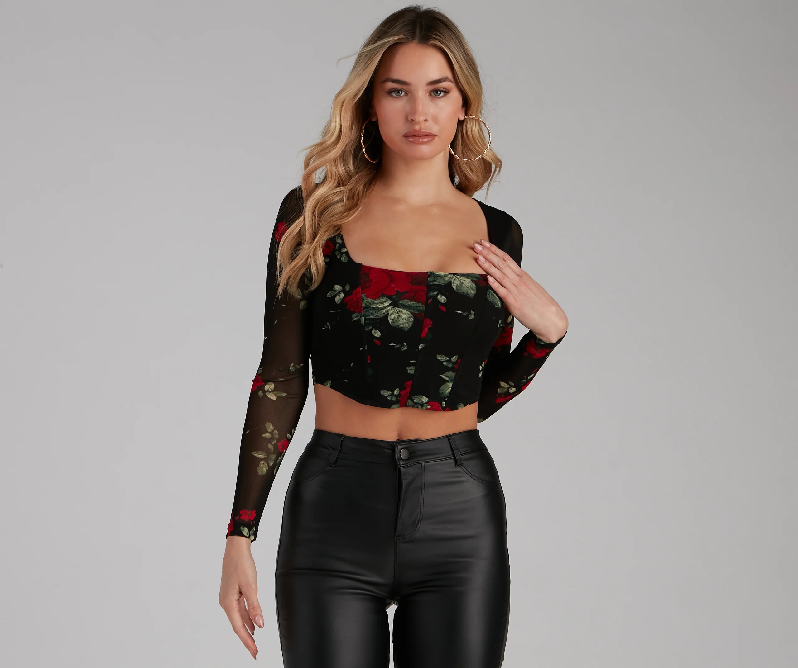You're sure to fall for this chic rose-bustier top! Featuring long sleeves, a square neck, and a fitted, corset-style bodice with flexible boning on a cropped hem. Composed of a mesh-lined knit fabric offering a moderate stretch. Perfect for styling with high-rise jeans.