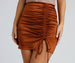 You're not dreaming, this satin mini skirt is so luxe and perfect for a night out! It features a high-rise waist, front slit with ruching and tie accent. Composed of a stretch-knit fabric with a moderate stretch. Style with a glitter bodysuit and heels.