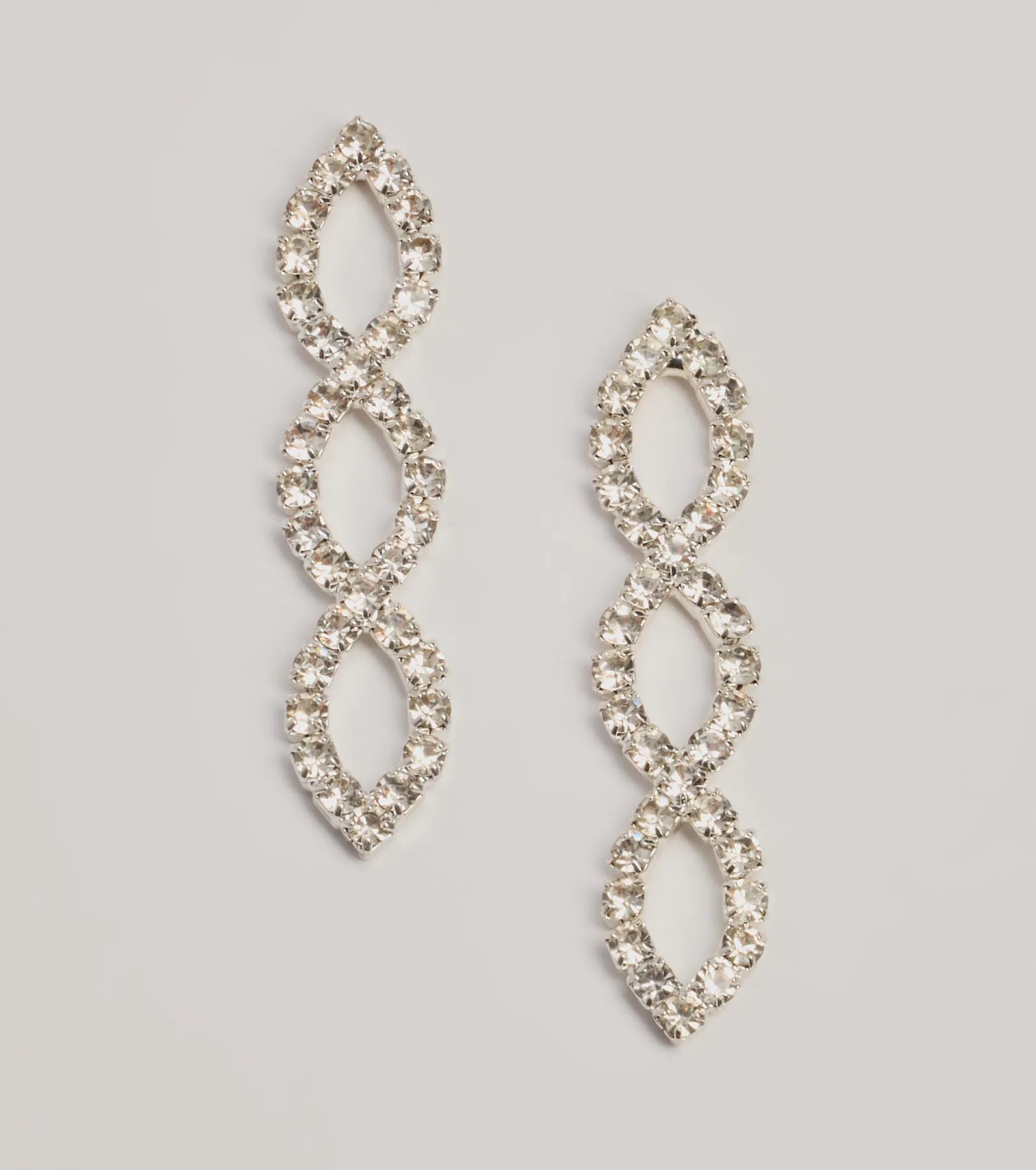 Create a luxe moment with earrings that bring radiance. The earrings feature an infinity drop design and mini rhinestones. Complete look with a lace midi dress for the perfect date night look!