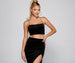 Channel a luxe night, in a crop top that is anything but basic. The crop top features a sleeveless square neckline, bungee spaghetti straps that lead to a cross-back design, a lace-up back, and a cropped hem. The top is composed of a lined velvet fabric that offers a form hugging fit with slight stretch. Complete look with the matching skirt.