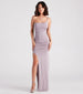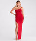 The sleek and sultry style of the Madalyn formal dress makes it the perfect option for parties, weddings, or fancy date nights! She features a sleeveless asymmetric one-shoulder neckline with a single spaghetti strap, a high waist seam, ruching down one side seam leading to a thigh-high slit, a floor-length hem, and a slim-fit silhouette. The smooth knit fabric offers plenty of stretch. Complete the look with strappy stilettos.