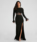 Inspired by 90's couture, the Madelyn formal crepe dress captivates the room with her diva-liscious allure! She features a crew neck, long sleeves with rhinestones and boa cuffs, and a rhinestone embellished bodice. Her form-hugging mermaid silhouettes display a show of leg in the sultry high-cut slit along the floor-length hem. The formal dress is composed of a crepe fabric with a moderate stretch. Complete the look with an elegant hair accessory for a captivating updo for a holiday party or wedding!