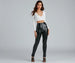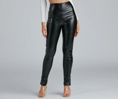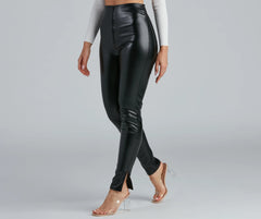 Create a major chic moment with leggings that showcase a sleek vibe! The leggings feature a high-rise waist, a skinny leg fit, and dual slits at the ankle. The leggings are composed of a lined faux leather fabric that offers a form-hugging fit with a moderate stretch. Complete look with a bustier and mules.