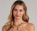 Elevate your formal dress in this glam necklace set featuring rhinestone trim with jewel tone insets. Complete the look in a faux fur wrap.
