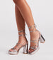 Have a major moment in these bold metallic platform heels! They feature an open square-shaped toe, thin criss-cross straps across the foot, thin lace-up straps that wrap around the leg, a platform sole, and a block heel. Style with a glitzy glitter clutch.